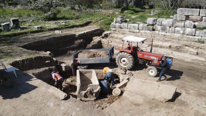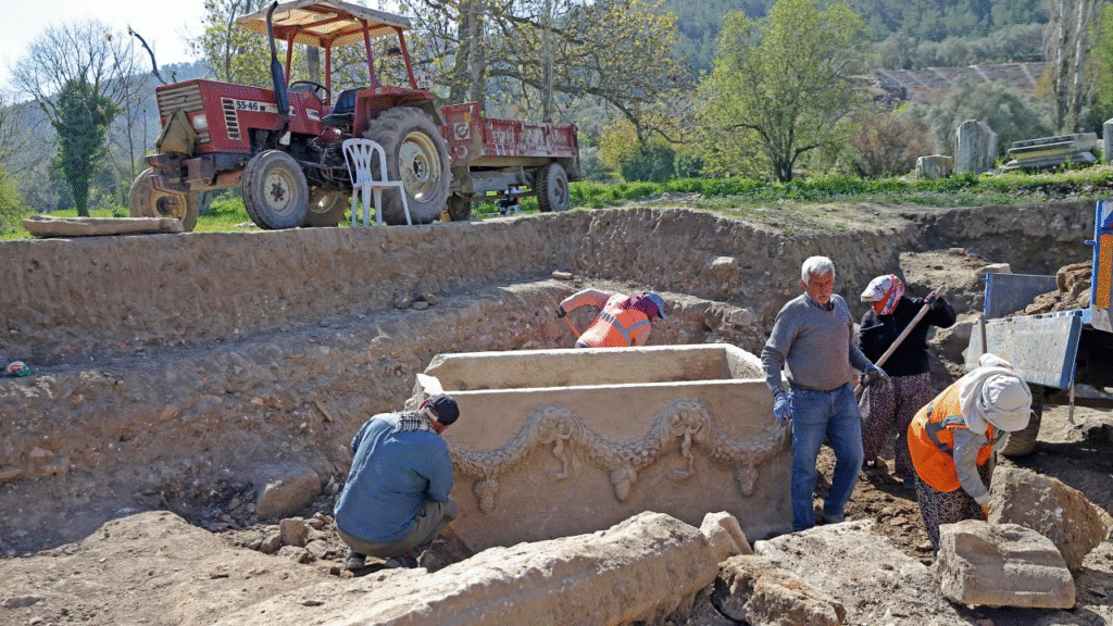 Muğla’nın Yatağan ilçesindeki Stratonikeia Antik Kenti’nde yürütülen kazı çalışmalarında, yaklaşık 2 bin yıl öncesine ait girlandlı bir lahit gün yüzüne çıkarıldı. Helenistik, Roma ve Bizans dönemlerinin yanı sıra Menteşe Beyliği, Osmanlı ve Cumhuriyet dönemlerine de ev sahipliği yapmış olan bu antik kent, “Gladyatörler Kenti” olarak da biliniyor. UNESCO Dünya Mirası Geçici Listesi’nde yer alan Stratonikeia, dünyanın en büyük mermer kentlerinden biri olarak kabul ediliyor.